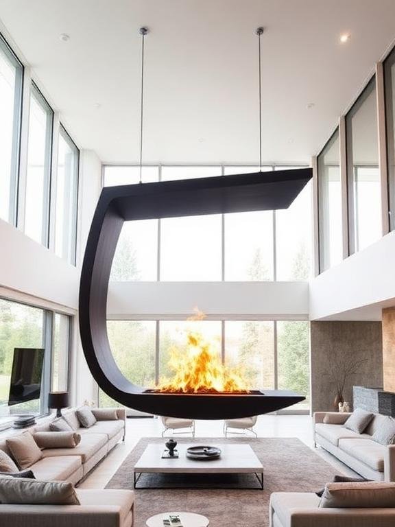 Space-Age Elegance. A hanging fireplace serves as an excellent choice for anyone who wants to create a strong visual impact.