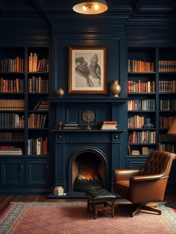 The fireplace area should use dark shelf paint colors which include navy blue and forest green to create a private sanctuary.