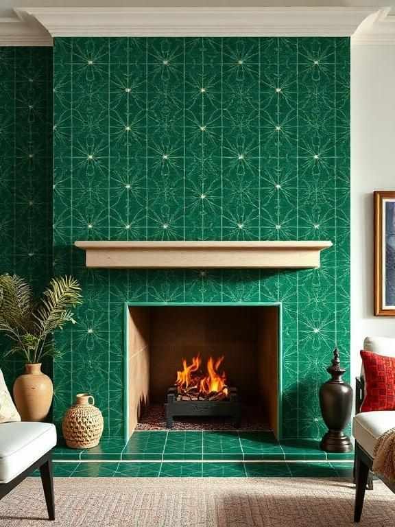 The combination of hand-painted tiles with bold geometric patterns creates an artistic transformation of ordinary fireplaces.
