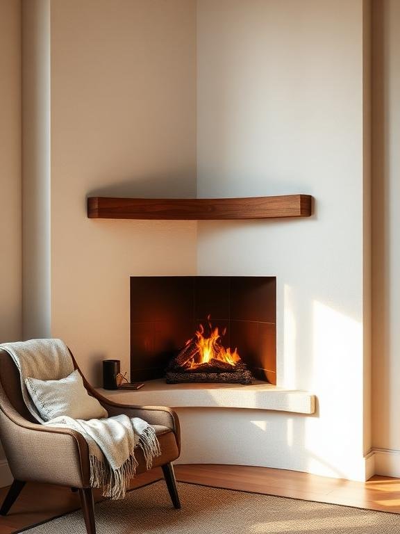 Treat a corner fireplace as an essential design feature instead of viewing it as an unimportant detail. Use a wrap-around mantel to tie it into the rest of the room. The design creates a cozy space which serves as an ideal spot for a small armchair and a lamp.
