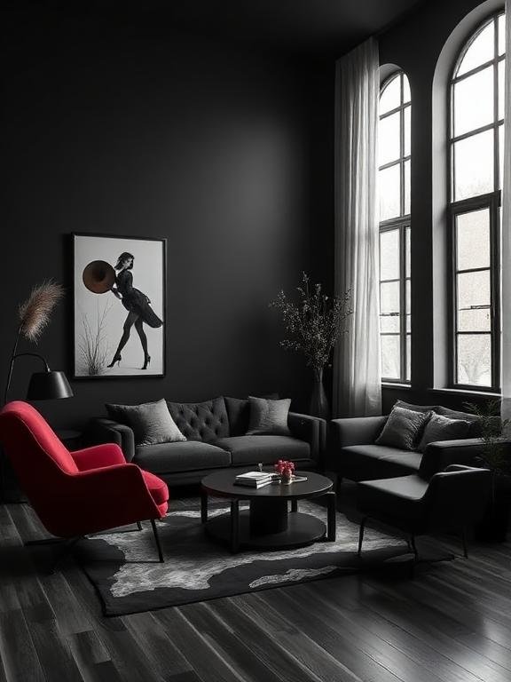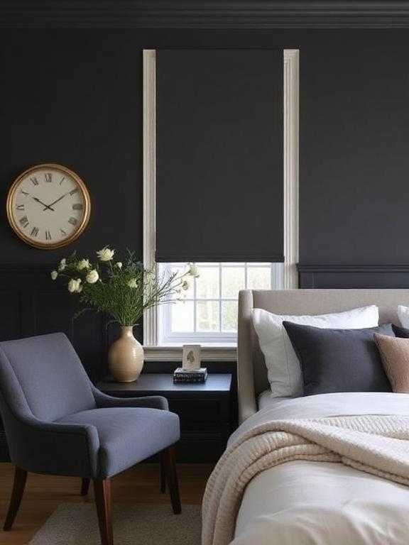 The right styling of black walls or furniture creates a bold and stylish appearance. The texture combination creates a dramatic effect which transforms into extreme comfort. The combination of black elements with beige bedding and soft rugs and wood accents creates a balanced visual appearance. The design approach helps to keep the space from creating an excessively dark or threatening atmosphere. The color combination includes Jet Black and Charcoal Black. The quick tip suggests that only one black accent wall or furniture item should exist to create design equilibrium.