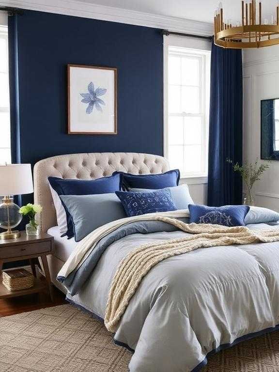 Navy blue functions as both a traditional color and a calming shade. The color combination works best for bedrooms which serve as areas for slumber and peaceful time. The room temperature remains comfortable because the combination of textured bedding and knit throws and plush pillows creates a soft atmosphere. The color combination includes Navy and Midnight Blue and Deep Indigo. The quick tip suggests that warm lights should be added to prevent a cold and harsh atmosphere.